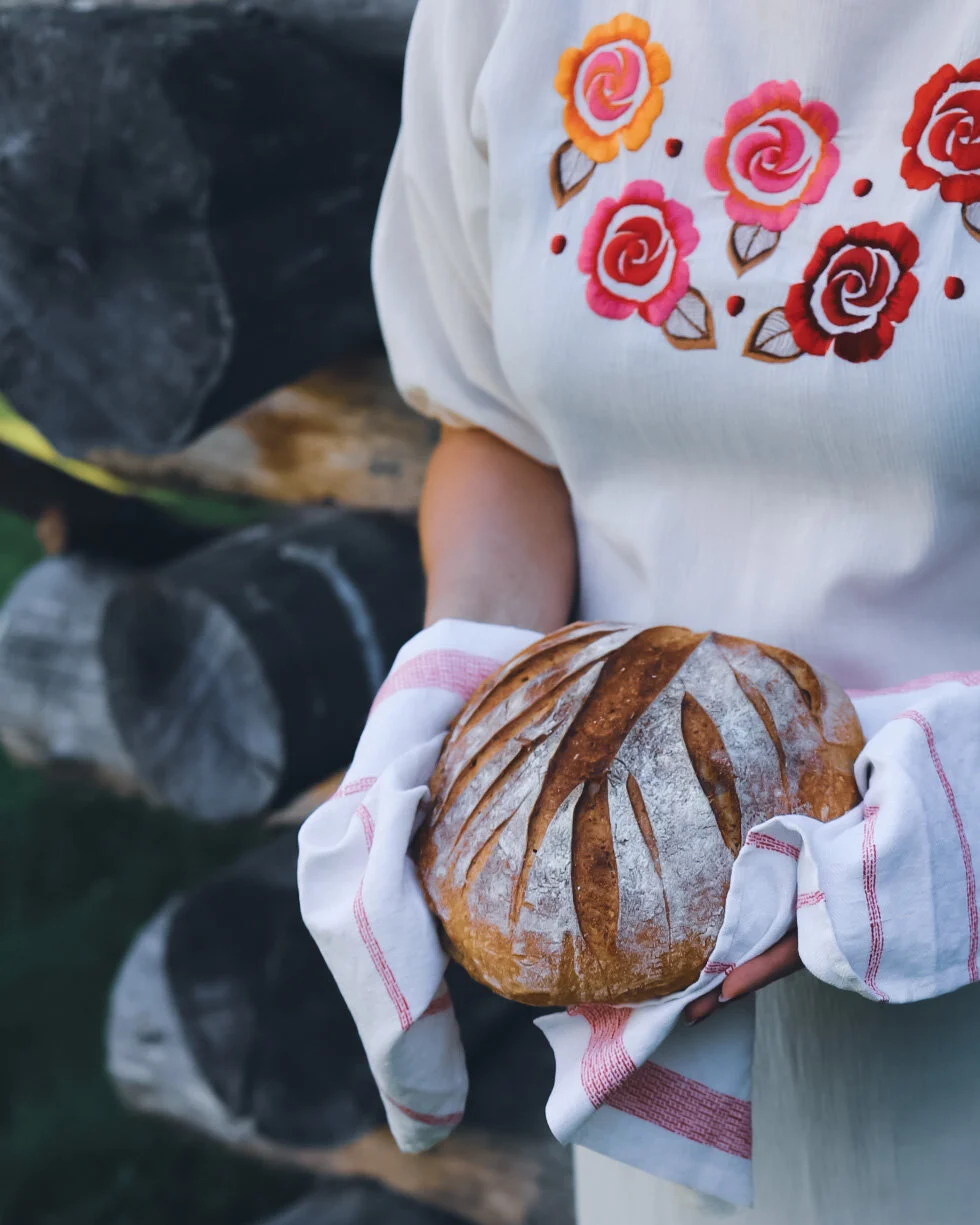 Laita uuni kuumenemaan 250 asteeseen. Kaada taikina pellille ja viiltele haluamasi kuviot pintaan. Jos leipä ei ole kohonnut hyvin, kannattaa tehdä syvemmät viillot. Laitan joskus irtokakkupohjavuuan reunat leivän ympärille, joka hieman tukee kohoamista, mutta voi laittaa hyvin ilmankin. Paista ensin 20 minuuttia ja sitten laske lömpötilaa 220 asteeseen ja paista 20 minuuttia. Leipä on kypsä, kun sen pohja kumisee koputtaessa kädellä. Leivän kannattaa antaa vetäytyä 1 tunti ennen leikkaamista.
