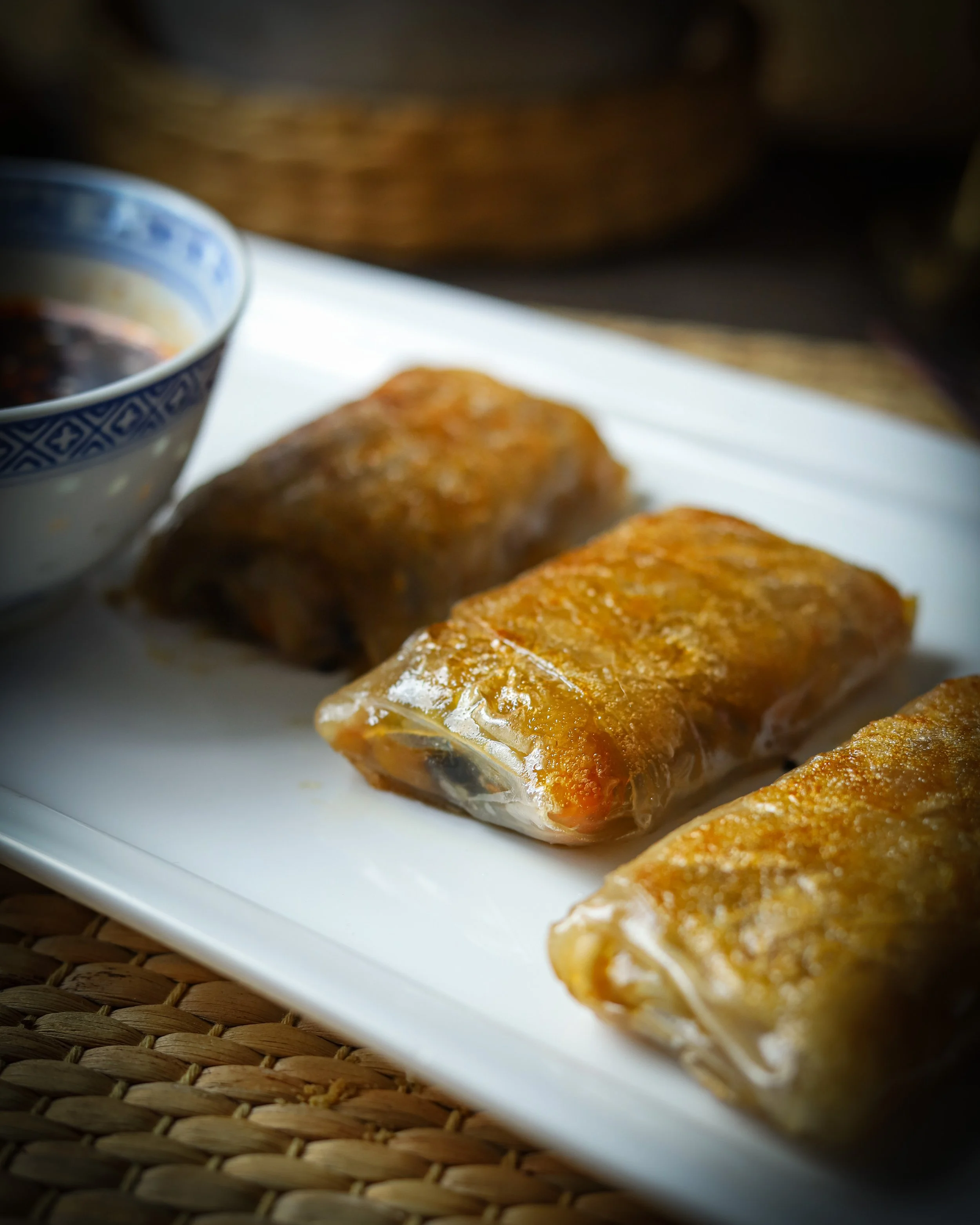 Kaada laakeaan astiaan vettä ja kaada sinne loraus vaahterasiirappia ja Teriyaki kastiketta. Sekoita hyvin ja aseta 1 riisipaperiarkki kerralla astiaan. Arkki notkistuu kostuessa ja sen voi taitella kun on vähän pehmennyt vedessä.